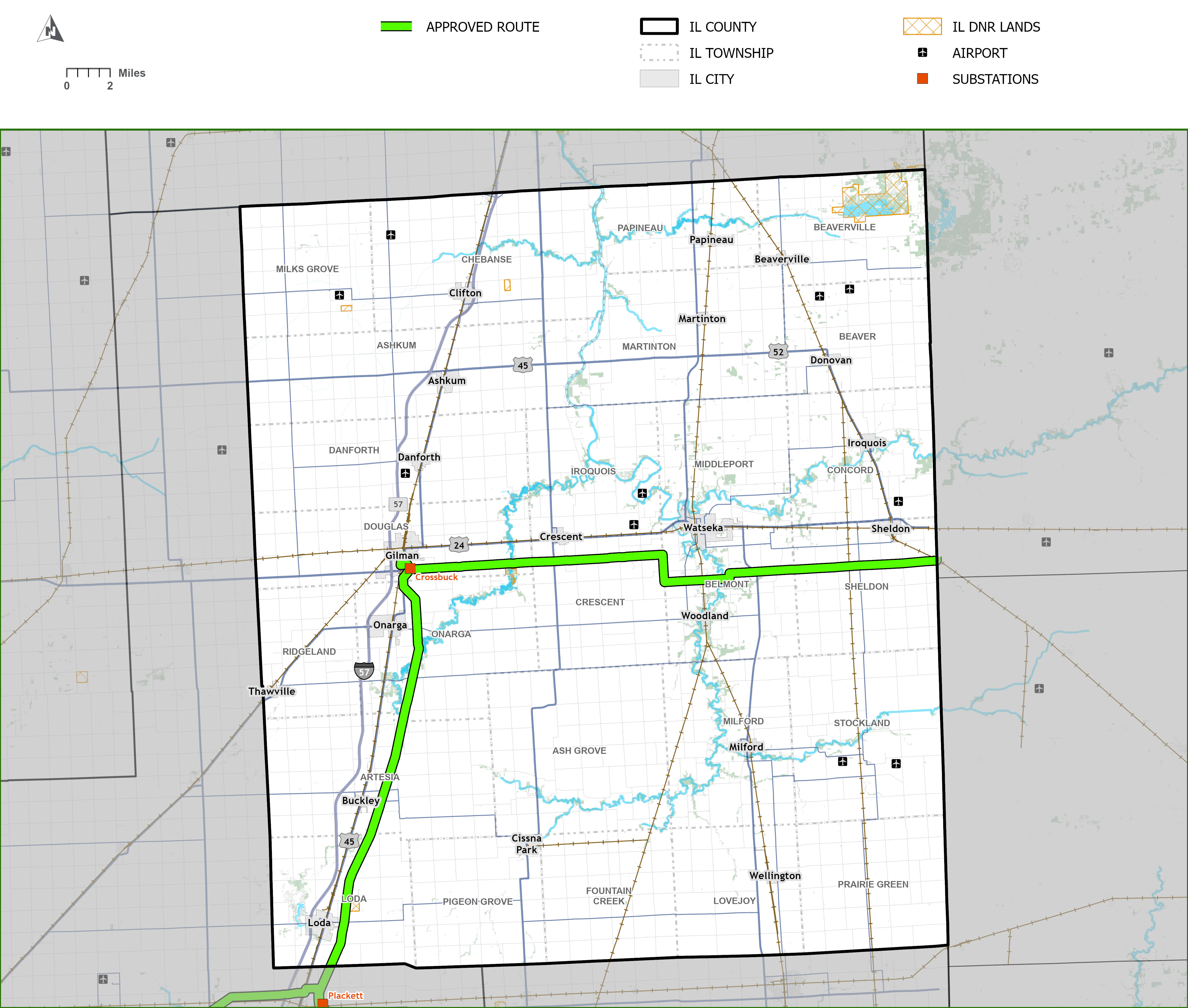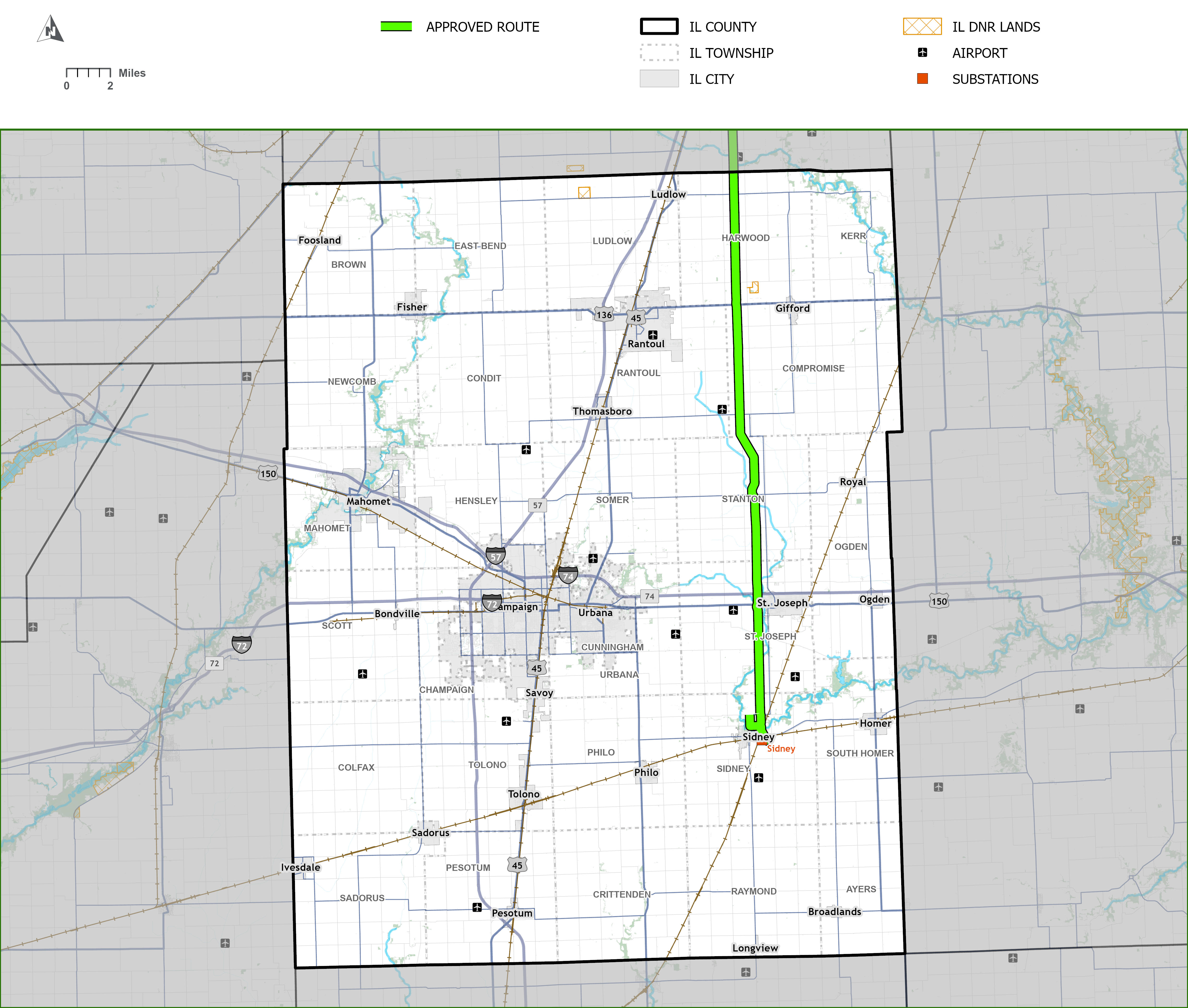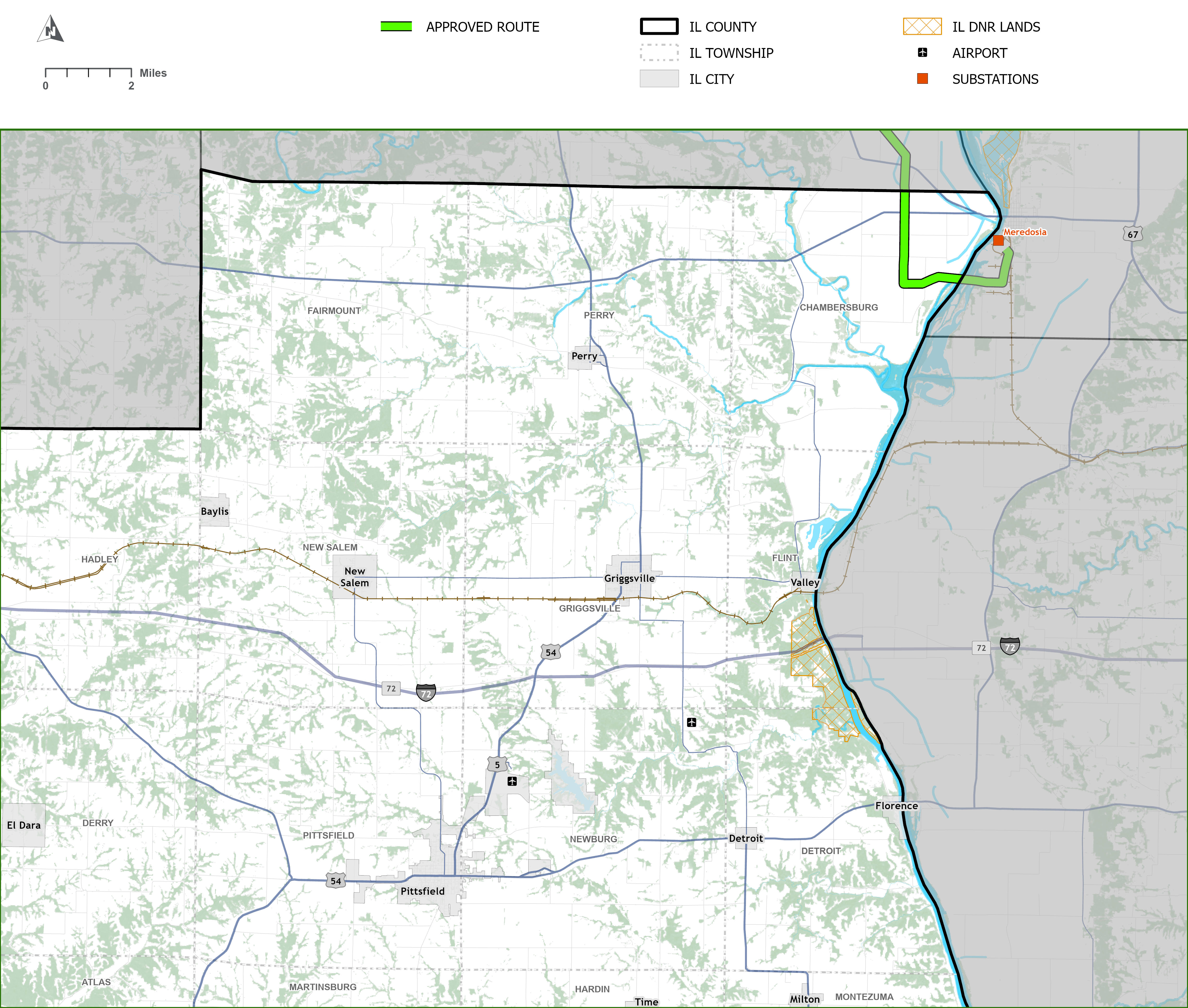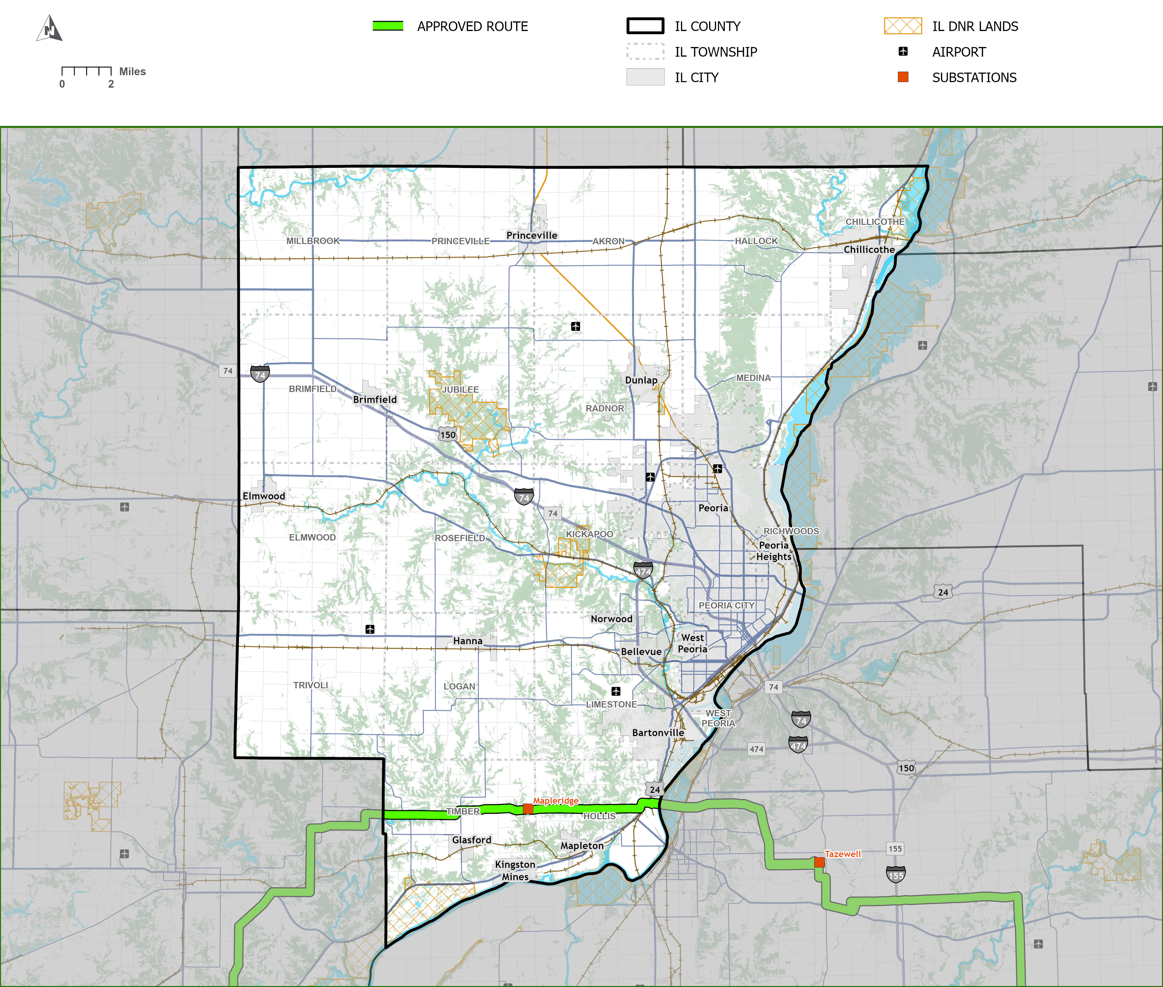 The Approved Route has approximately 2 miles of new transmission lines. The new 345 kV circuit will be constructed in a new corridor to connect separate existing transmission corridors to utilize existing structures to cross the Illinois River.