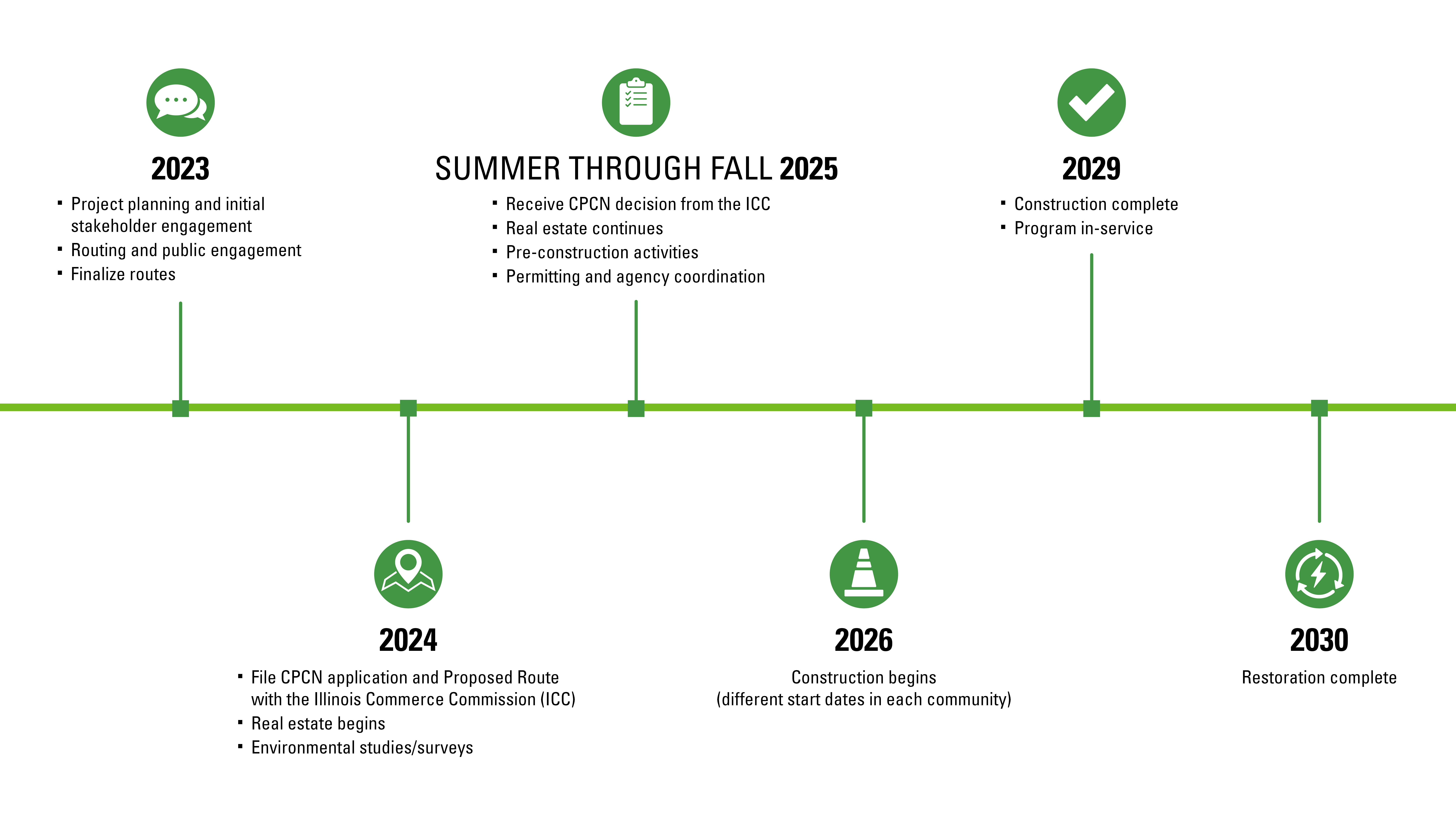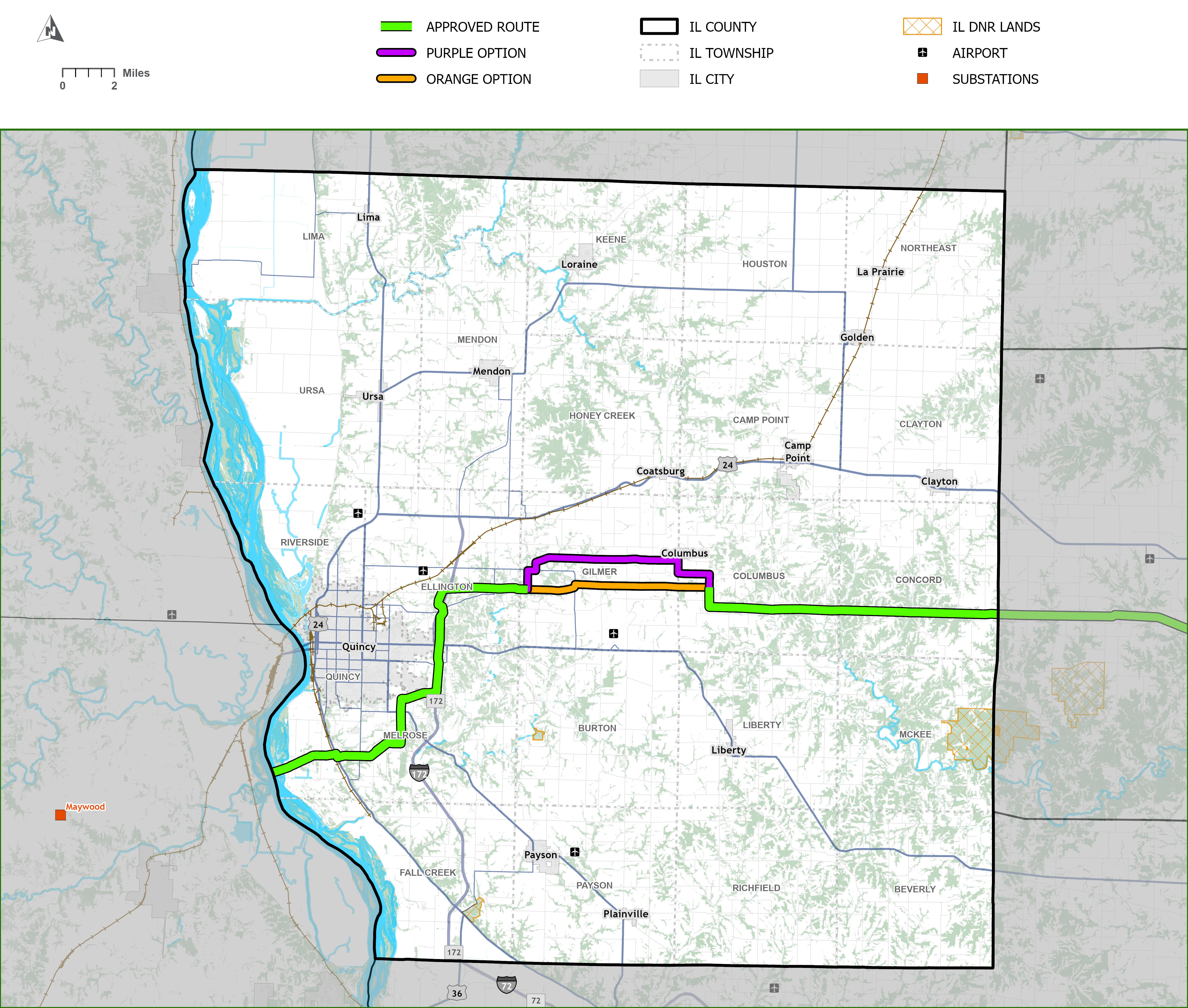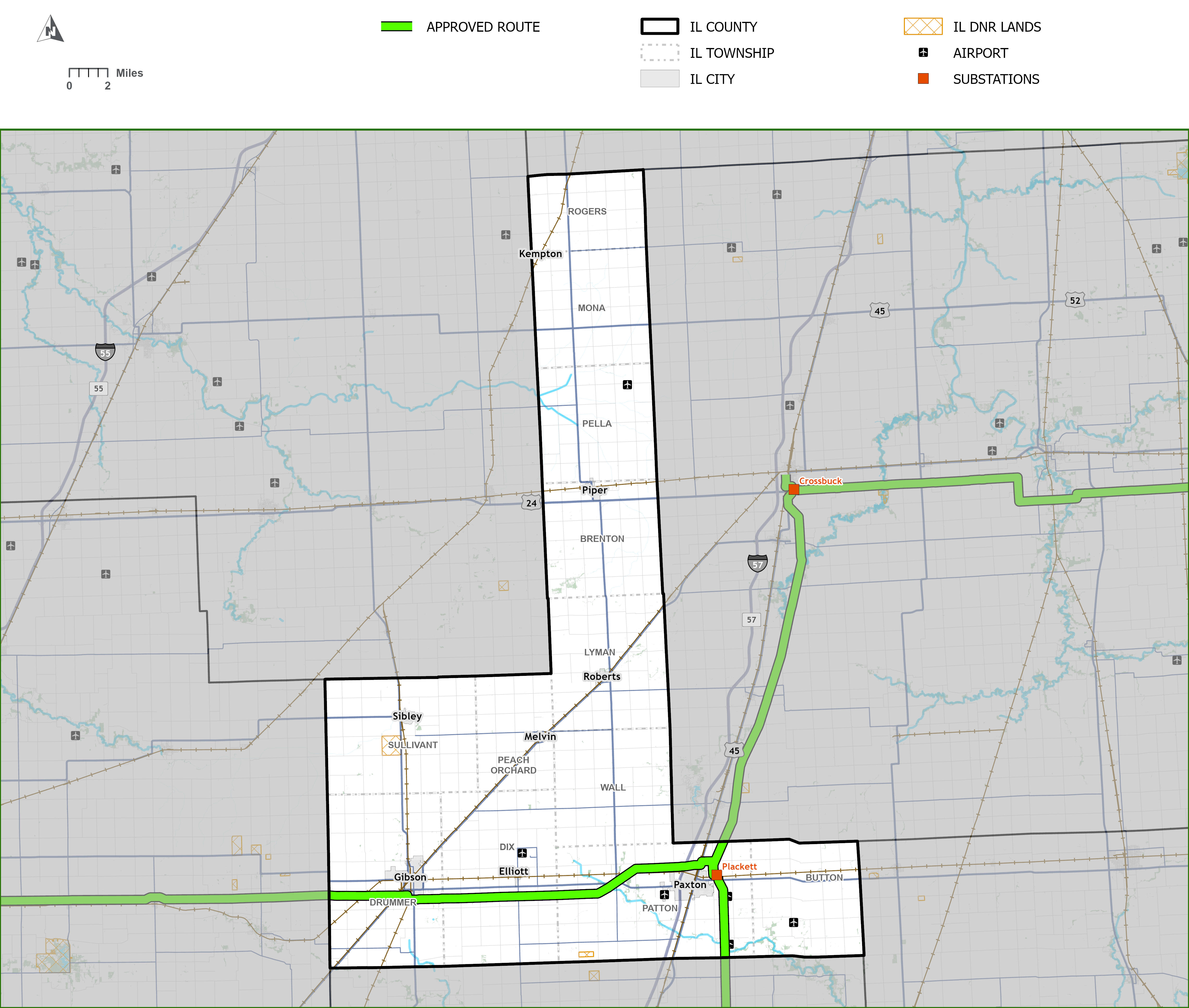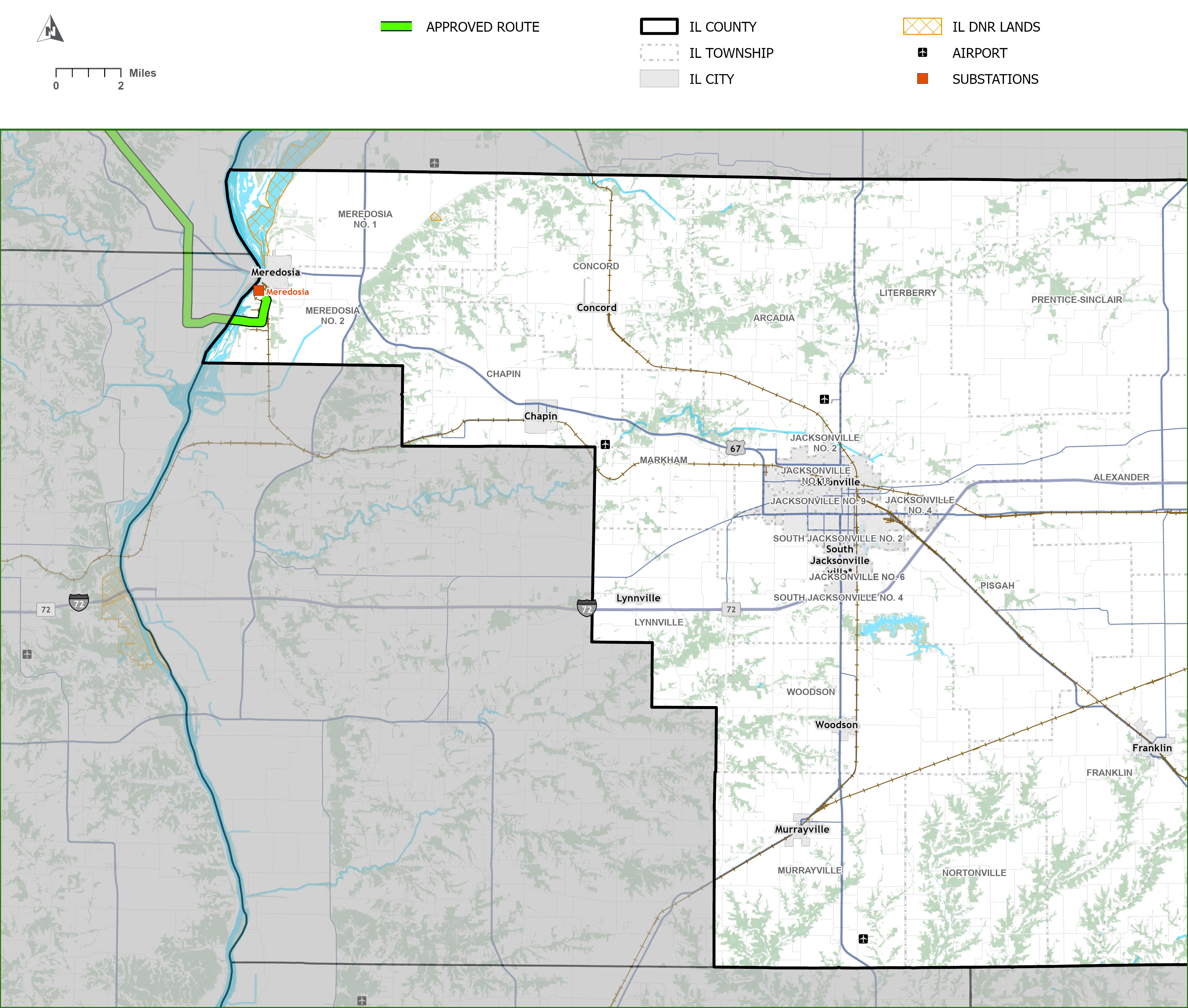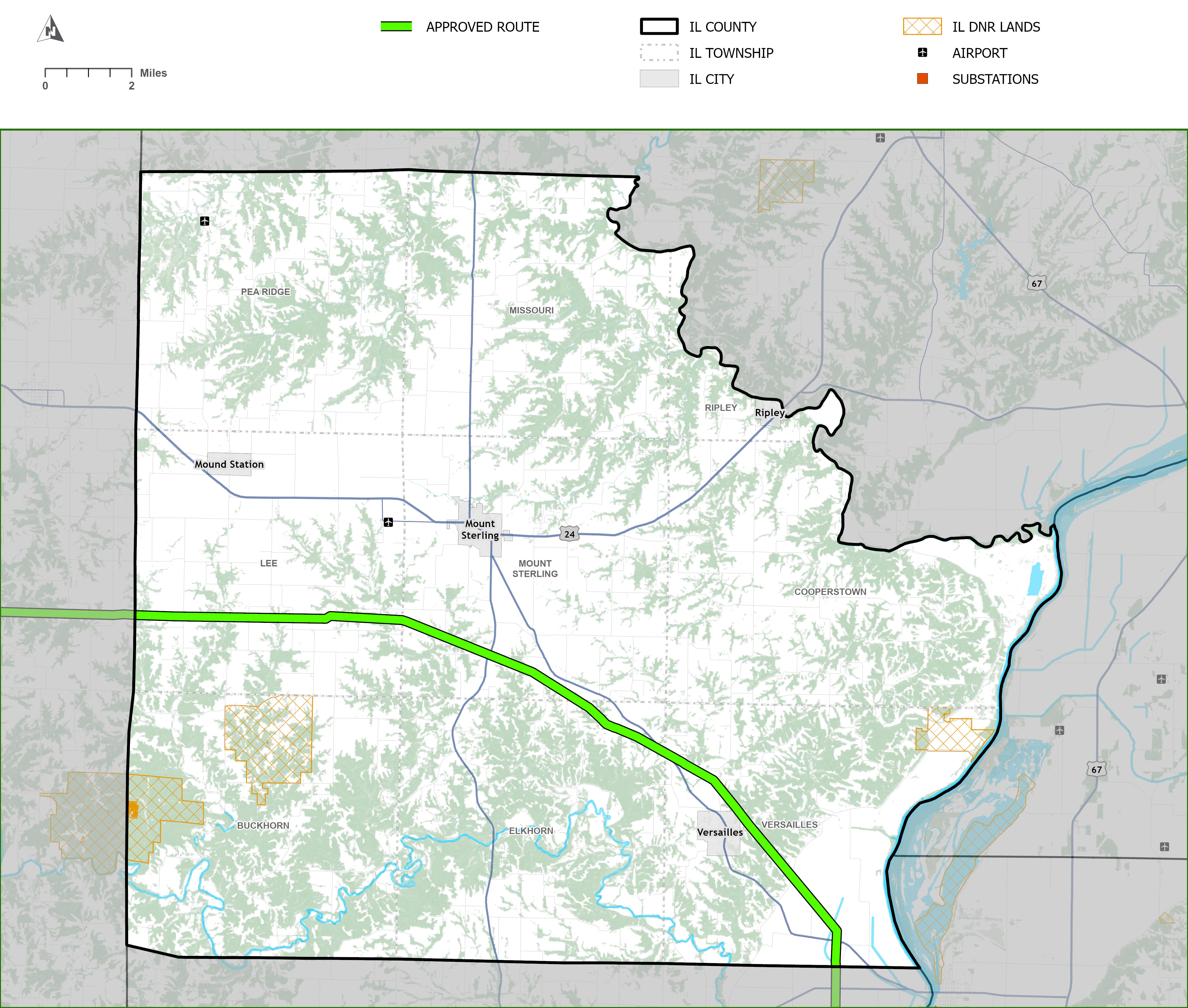 The Approved Route has approximately 2 miles of new transmission lines. The new 345 kV circuit will be constructed in a new corridor to connect separate existing transmission corridors to utilize existing structures to cross the Illinois River.