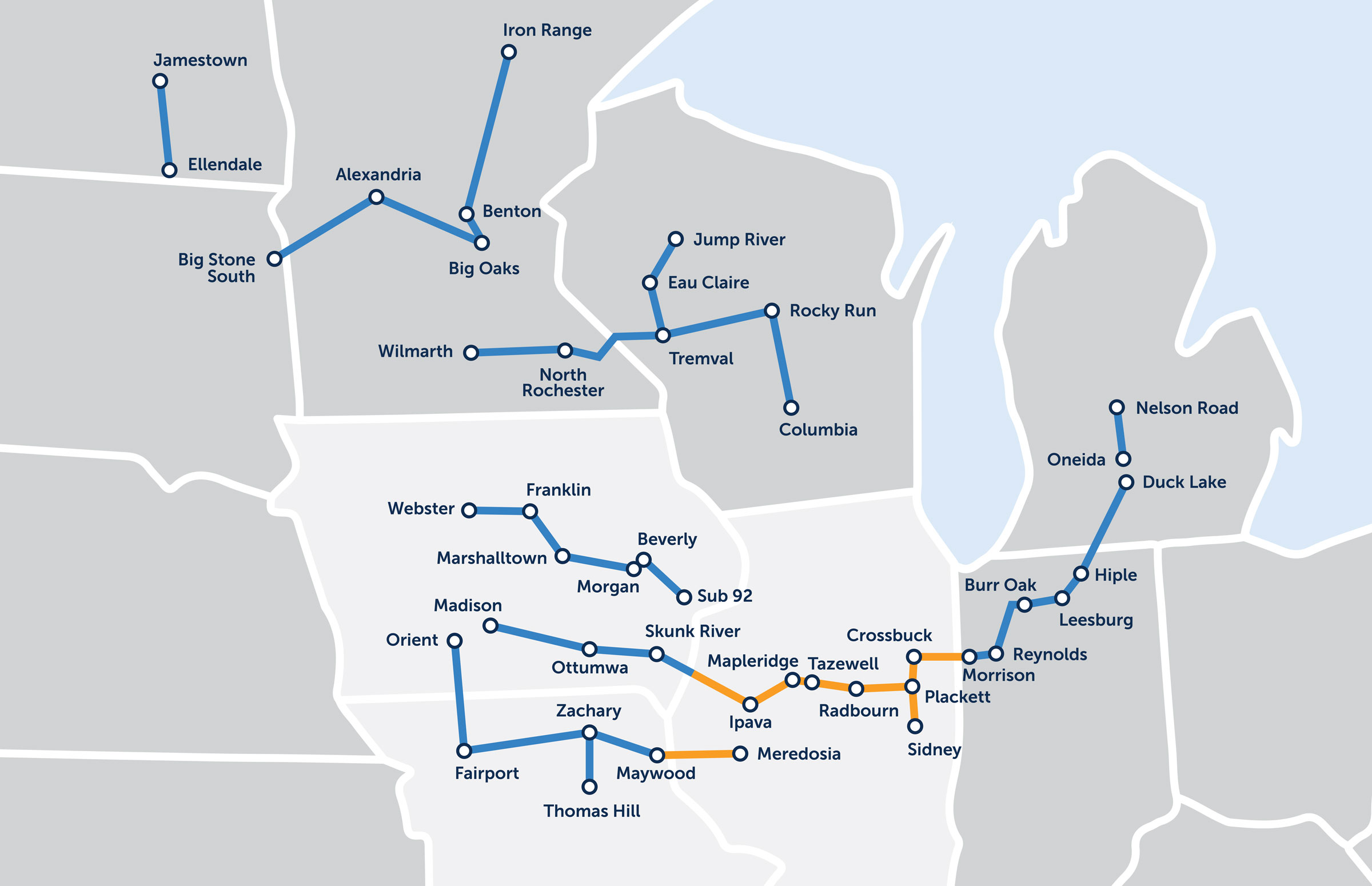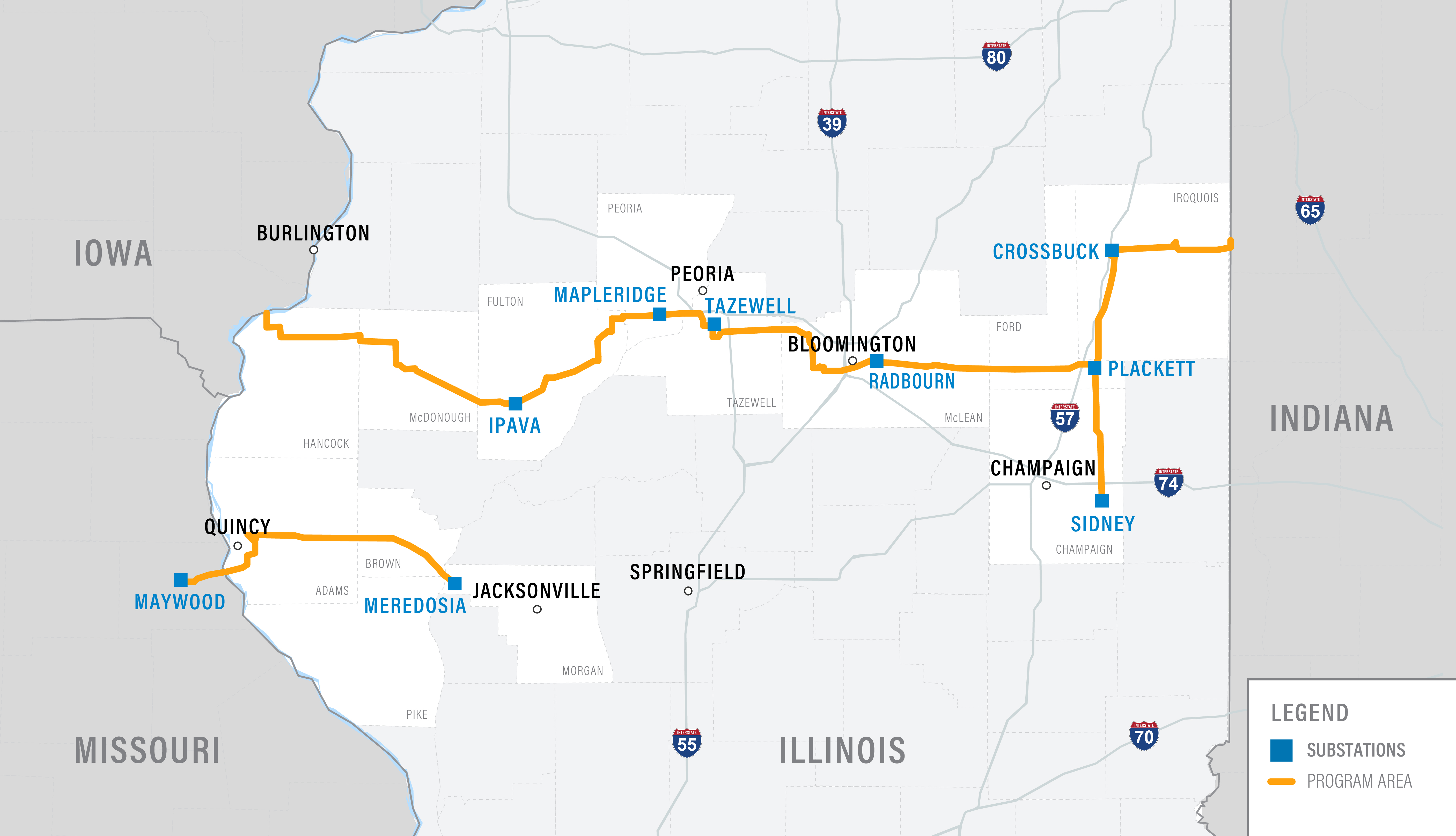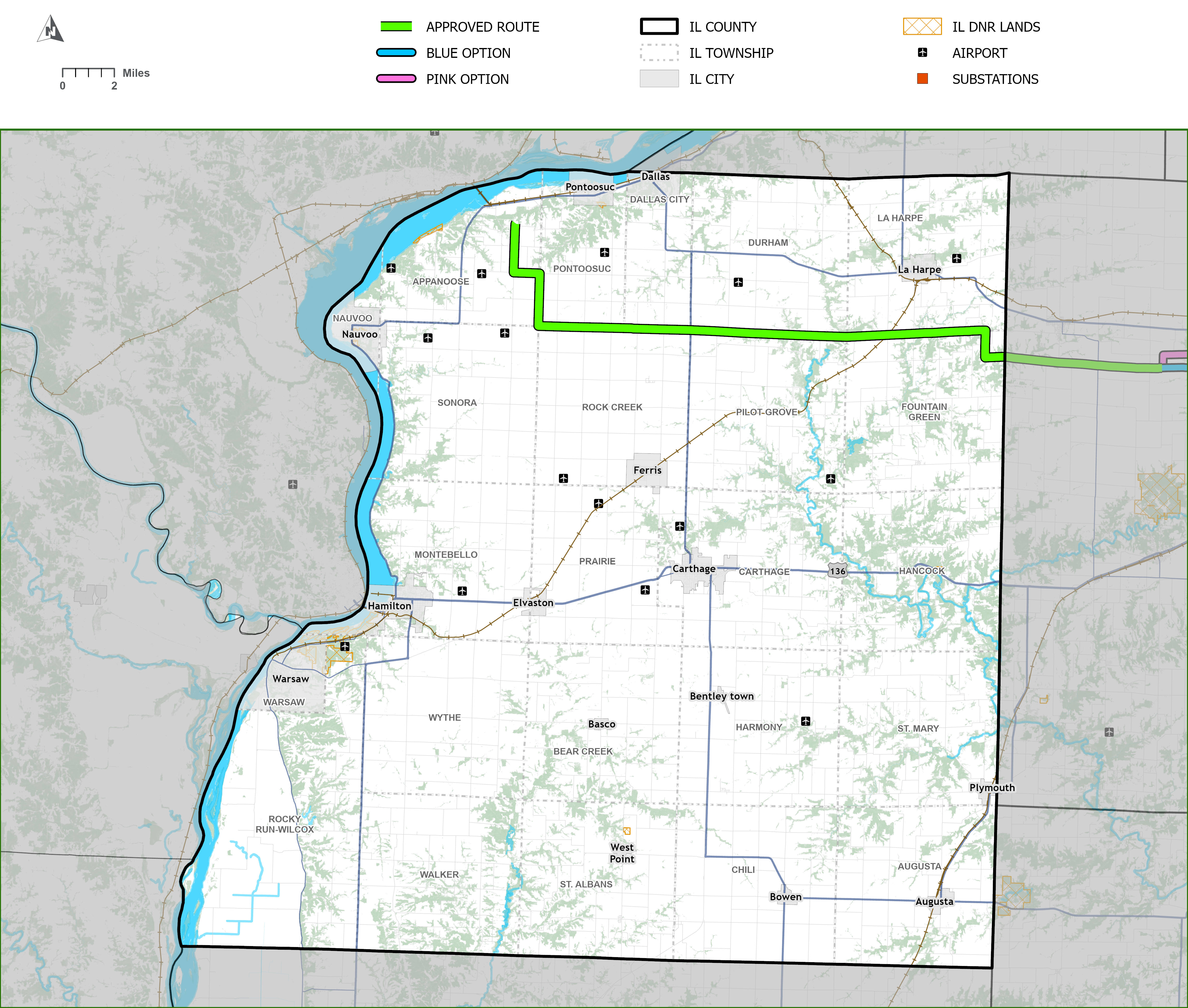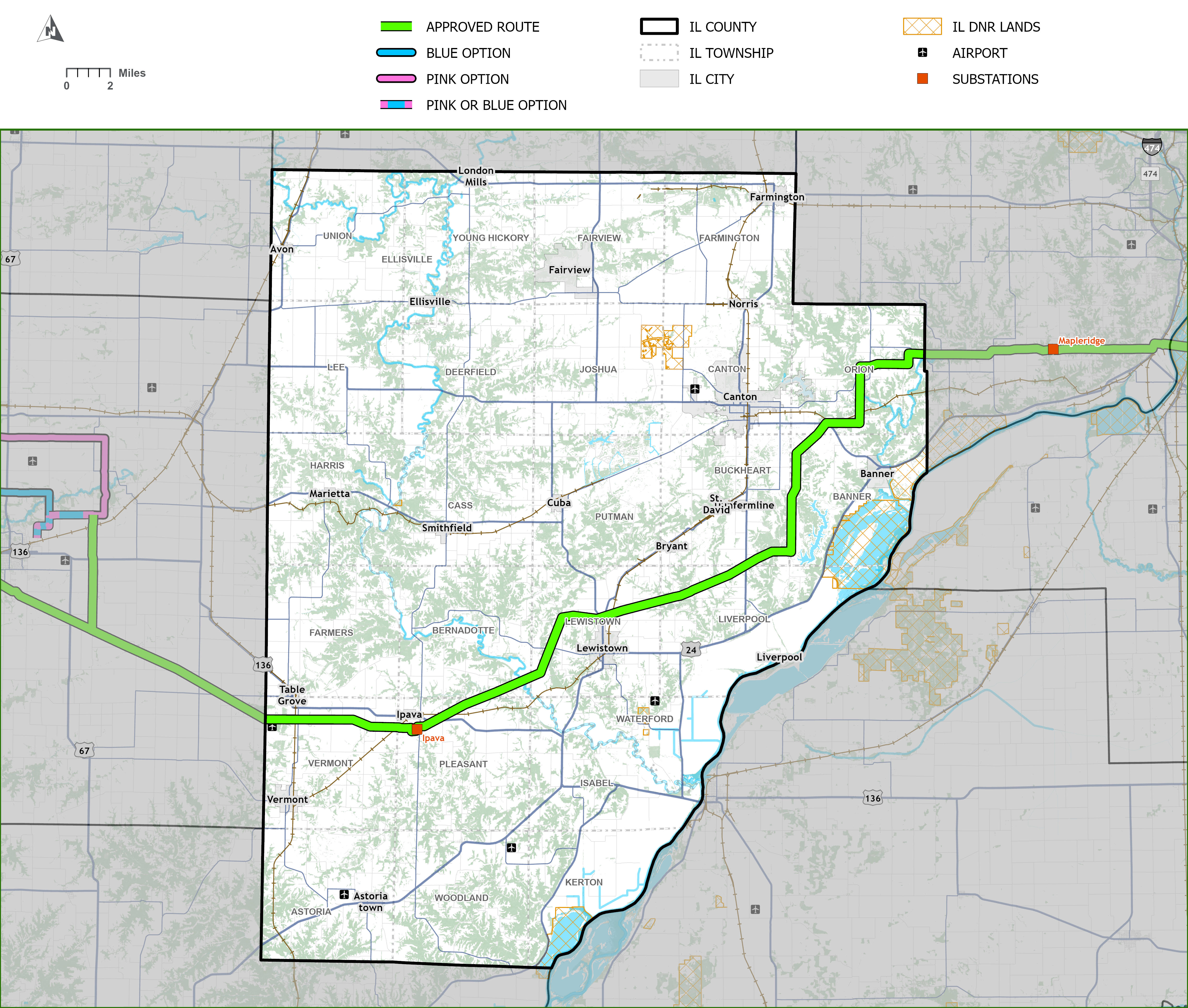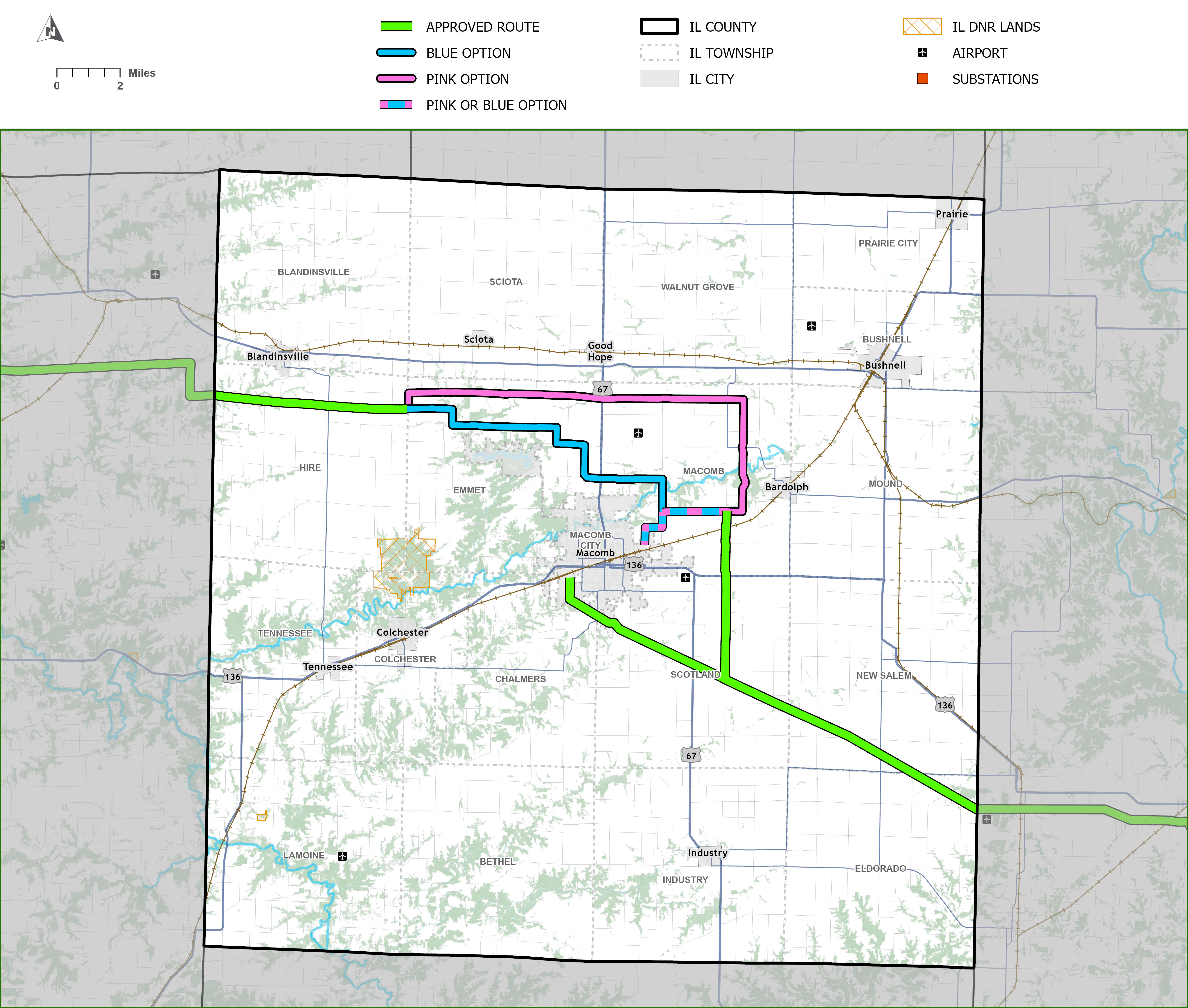 The Approved Route includes two options (pink or blue) to build a new, 138 kV and 345 kV double circuit north of the City of Macomb. We will only be constructing one of these routes for the line.