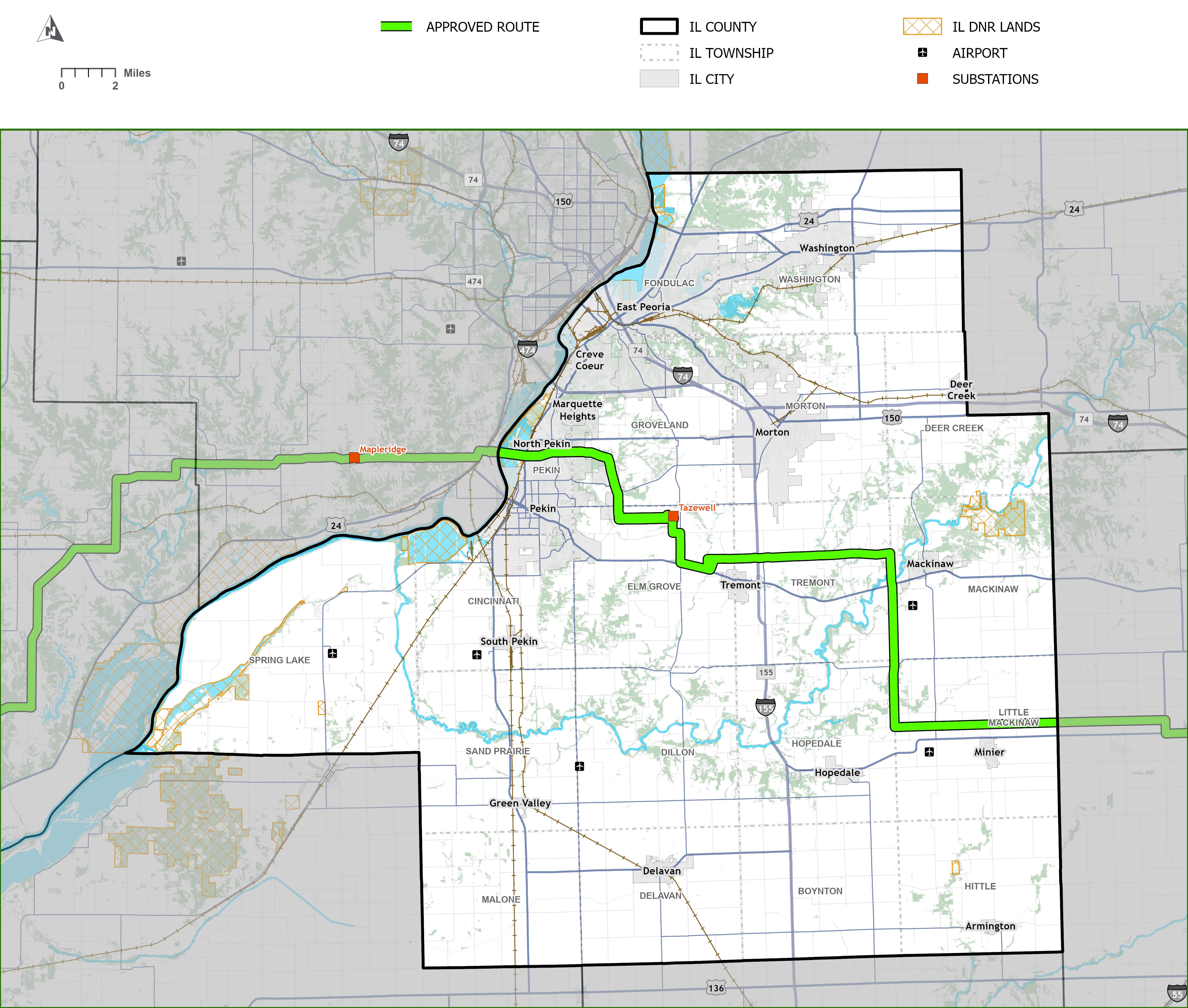 The Approved Route has approximately 40 miles of new and upgraded transmission lines in Tazewell County.